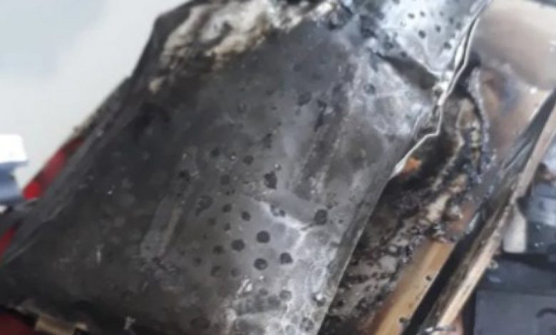 O aparelho ficou desconfigurado depois de pegar fogo, ele abriu e se dividiu em duas partes.