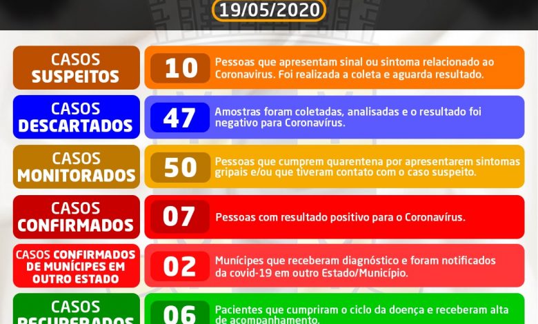 O boletim epidemiológico Nº 64 registra ainda 47 casos descartados para Covid19. Nossos números são dinâmicos e, na medida em que as investigações clínicas e epidemiológicas avançam, os casos são reavaliados, sendo passíveis de reenquadramento na sua classificação.