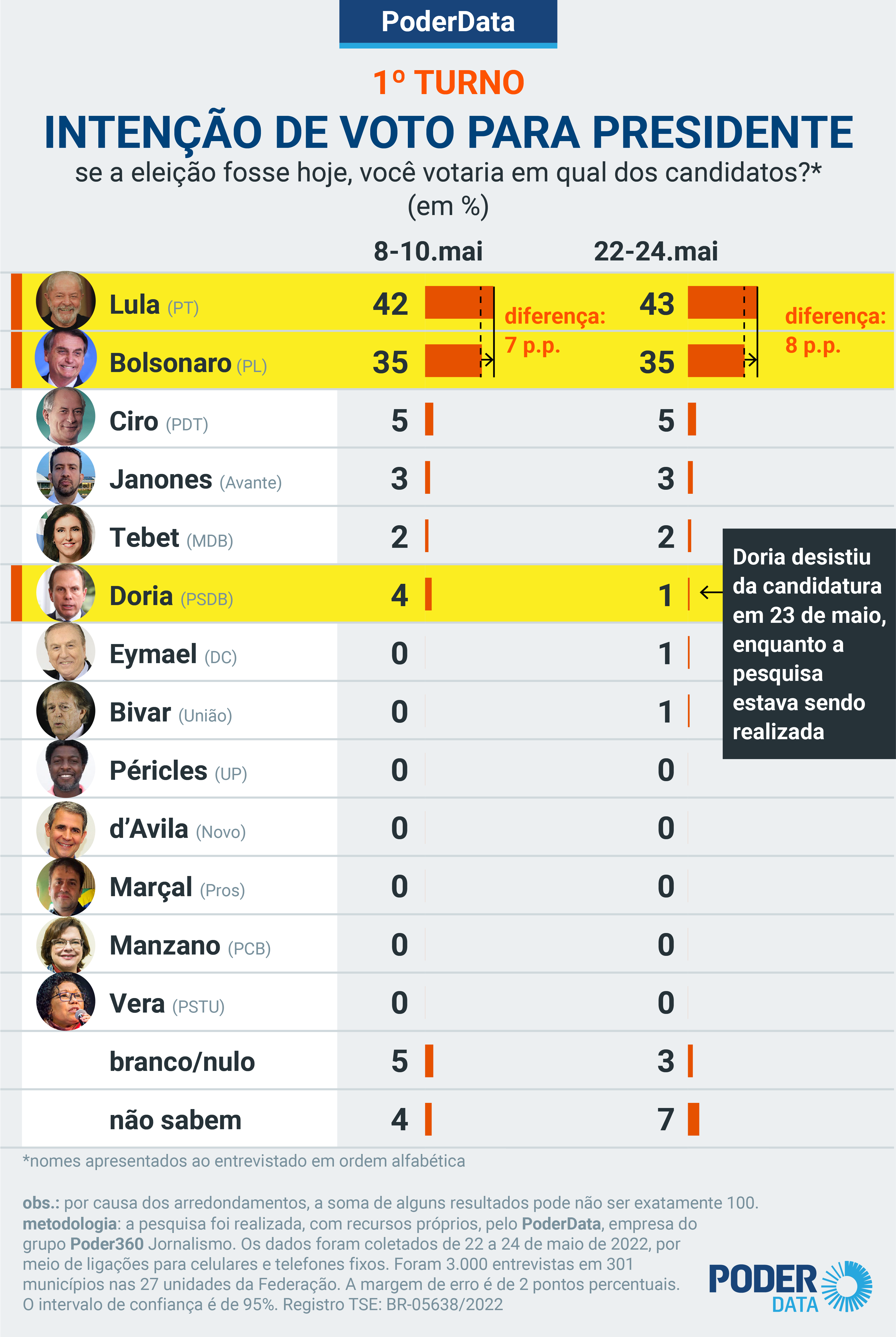 O TSE (Tribunal Superior Eleitoral) determina que pesquisas sejam registradas 5 dias antes de serem publicadas. O último levantamento do PoderData havia sido registrado na 5ª feira, 19 de maio de 2022.