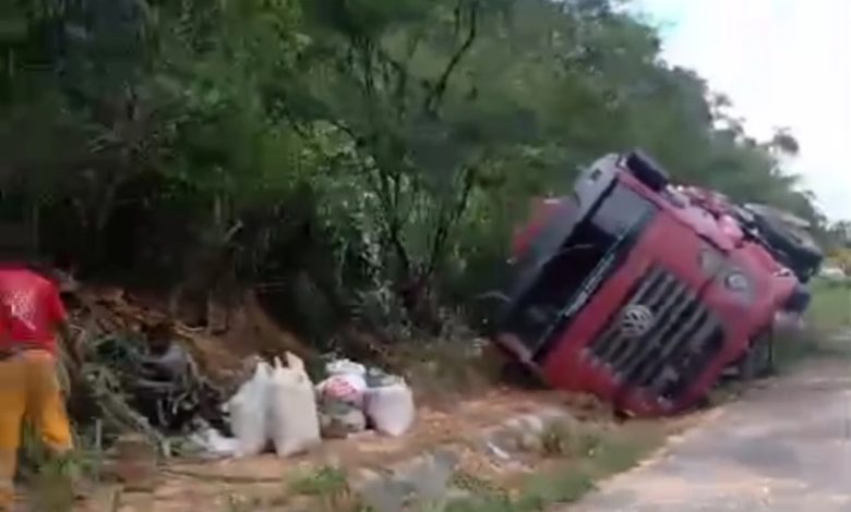 No início da tarde desta quinta-feira, 04 de abril, um caminhão tombou na BR-101, no trecho de Pedra do Cavalo.