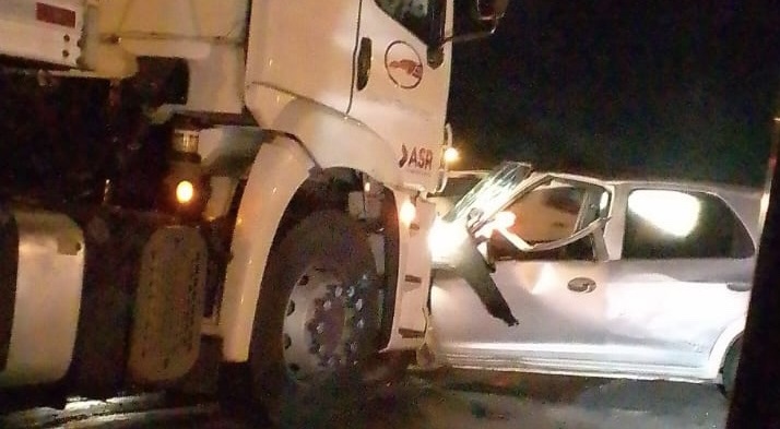 Em imagens, é possível ver que o veículo modelo Celta, colidiu em uma carreta tipo baú.