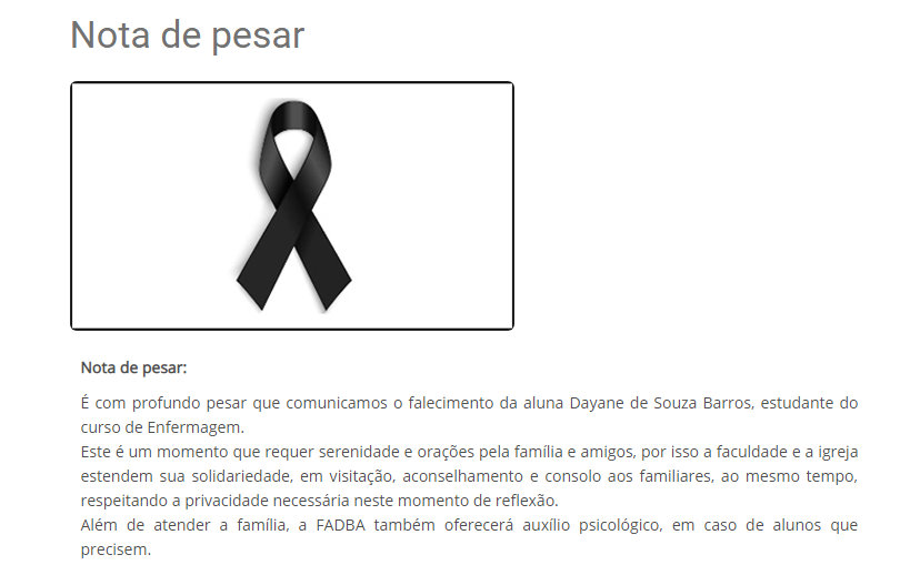 A Faculdade Adventista da Bahia emitiu uma NOTA DE PESAR pelo falecimento da jovem que cursava enfermagem na instituição e era natural de Belém do Pará. Muitos amigos e familiares acreditam na hipótese de suicídio, por conta de depressão, e realizaram postagens nas redes sociais lamentando o ocorrido. A Polícia Civil está investigando o caso.