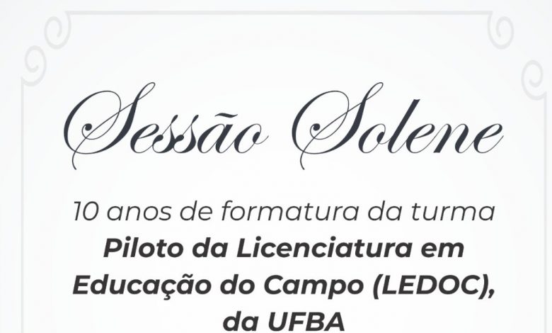 A Câmara de Vereadores de Cruz das Almas, através do mandato do vereador Pedro Melo (PT), vai realizar no próximo domingo, 11, às 08h30, uma Sessão Solene em celebração aos 10 anos de formatura da turma Piloto de Licenciatura em Educação do Campo (LEDOC), da Universidade Federal da Bahia (UFBA).