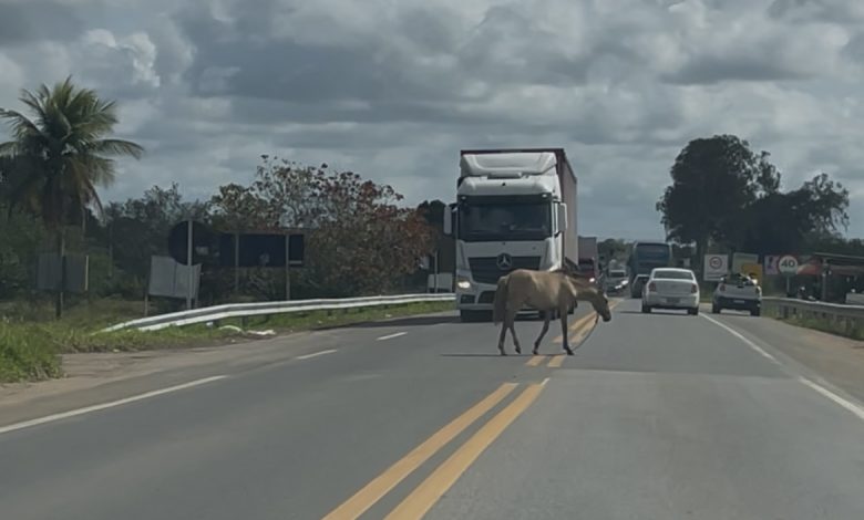 Cavalo é flagrado passeando entre veículos na BR-101, em Cruz das Almas