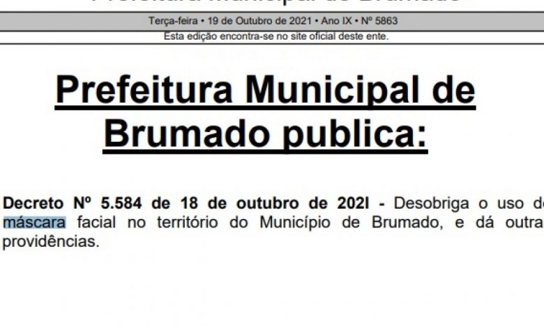 A prefeitura de Brumado, cidade localizada no centro-sul da Bahia, liberou os moradores do uso de máscaras faciais contra a Covid-19 nesta terça-feira (19). A decisão, publicada no Diário Oficial do município, desobriga o uso na maioria dos ambientes fechados e abertos.