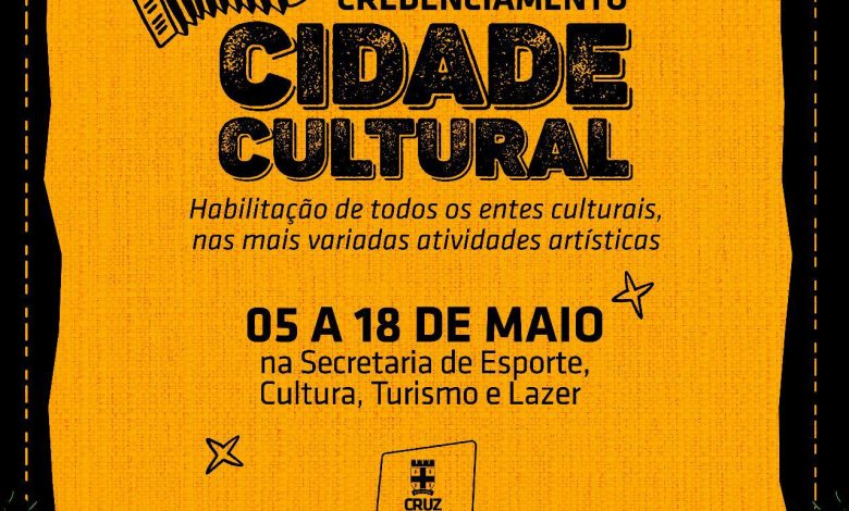 A partir desta sexta-feira (05) até o dia 18 de maio, a Secretaria de Esporte, Cultura, Turismo e Lazer vai realizar o Credenciamento Cidade Cultural, com o objetivo de credenciar, fazedores de cultura de todos os segmentos artísticos para futuras contrações de apresentações no município.