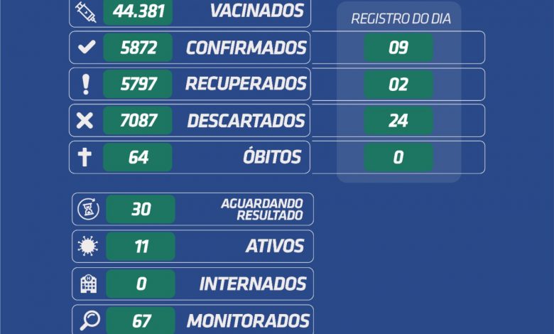 No total *11 casos estão ativos*, sendo que *não há pacientes internados* em Unidades Hospitalares de referência para Covid-19.