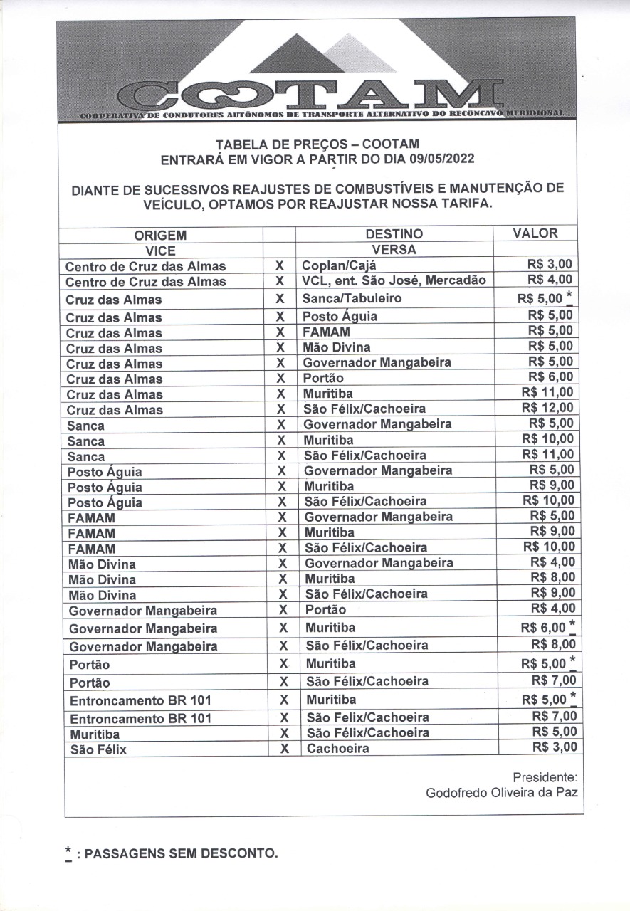 A Cooperativa de Condutores Autônomos do Transporte Alternativo do Recôncavo Meridional (COOTAM) vai reajustar os preços das passagens de transporte alternativo da linha Cruz das Almas x São Félix/Cachoeira. O anúncio foi feito internamente entre os condutores e o site Informe Cruz obteve com exclusividade essa informação.