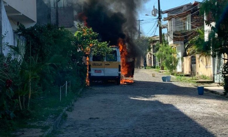 Van de transporte escolar pega fogo em Cruz das Almas; Bombeiros apagam as chamas; veja o vídeo