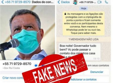 O governador Rui Costa (PT) vem sendo alvo de um golpe utilizando as redes sociais. Com a foto de Rui e um número falso os criminosos abordam pessoas para tentar atuar. “Já denunciei à polícia, que vai investigar o caso”, disse o governador.