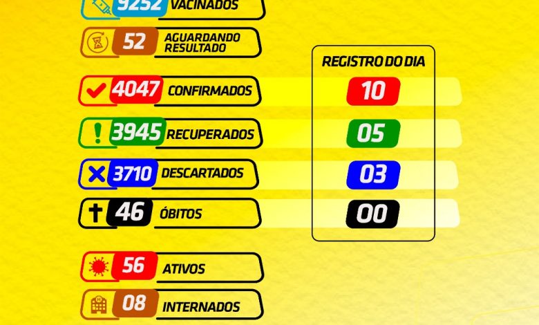 Foram confirmados 10 novos casos de Coronavírus e descartados 03 casos que aguardavam resultados dos exames, nesse domingo, dia 25 de abril de 2021.