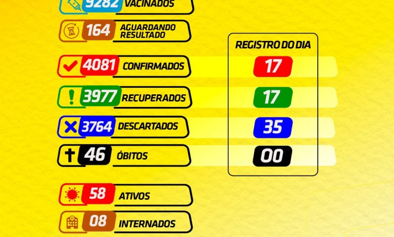 *Foram confirmados 17 novos casos* de Coronavírus e descartados 35 casos que aguardavam resultados dos exames, nessa terça-feira, dia 27 de abril de 2021.
