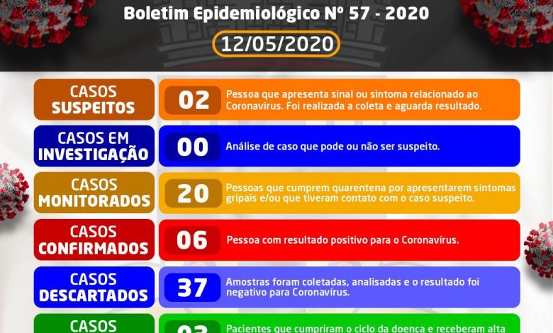 O boletim epidemiológico Nº 57 registra ainda 37 casos descartados para Covid19. Ressaltamos que os números são dinâmicos e, na medida em que as investigações clínicas e epidemiológicas avançam, os casos são reavaliados, sendo passíveis de reenquadramento na sua classificação.