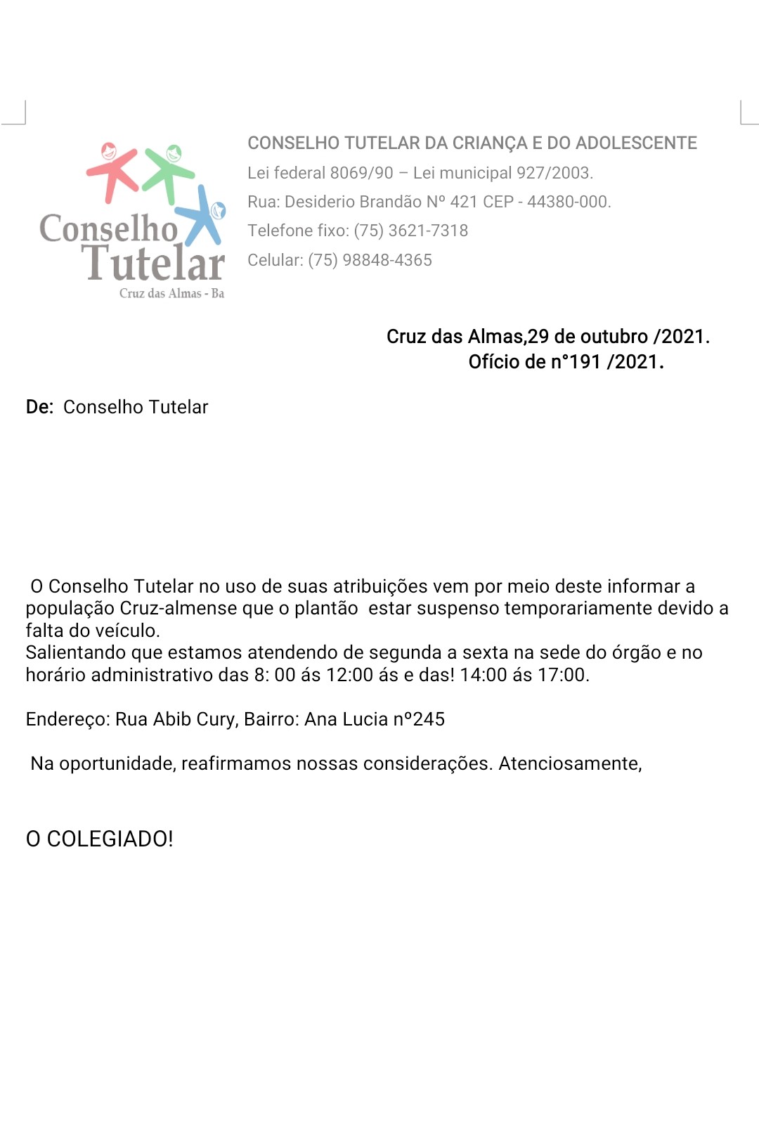 O Conselho Tutelar de Cruz das Almas divulgou uma nota à imprensa, na noite desta sexta-feira (29), informando que os plantões estão suspensos temporariamente, por falta de veículo.