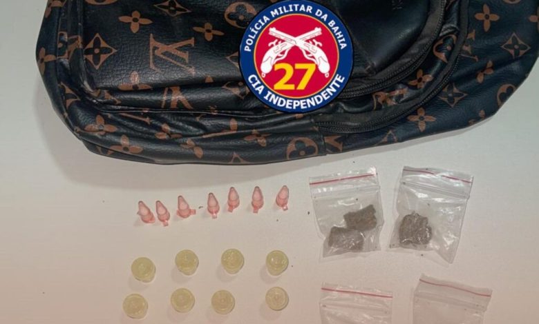 A guarnição abordou o indivíduo e, durante a busca pessoal, foram encontrados no interior de uma bolsa preta, a qual estava em sua posse, os seguintes materiais: 24 pinos contendo substância aparentando ser crack; 7 pinos pequenos contendo substância em pó de cor branca, aparentando ser cocaína; 6 pacotes pequenos com substância aparentando ser maconha; e 1 bolsa pequena cor preta com detalhes marrom.
