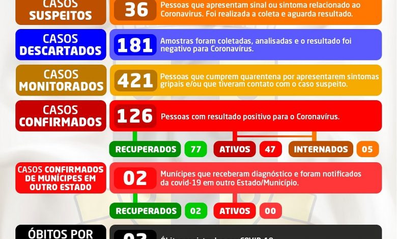 Apresentamos 126 casos confirmados para COVID-19, e destes 47 (quarenta e sete) ATIVOS, sendo acompanhados pela vigilância em saúde, estando agora 05 destes internados.