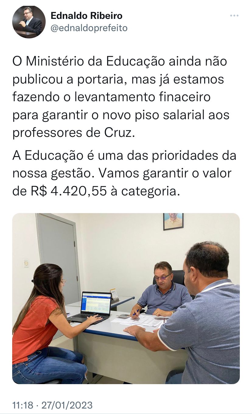 O prefeito de Cruz das Almas, Ednaldo Ribeiro, num post nas redes sociais, garante o cumprimento do piso nacional aos professores de R$ 4.420.55 à categoria.