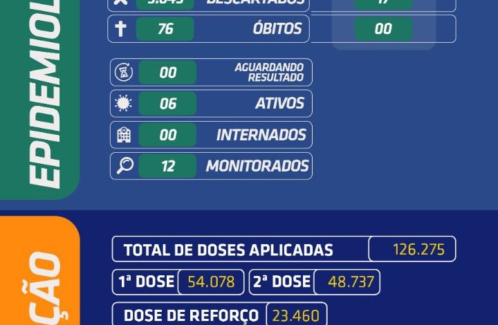 No total 06 casos estão ativos, sendo que não há paciente internado. O Município já confirmou 8.116 casos, e 76 óbitos. No momento ninguém aguarda resultado de exame, e 8.034 pacientes já estão recuperados.