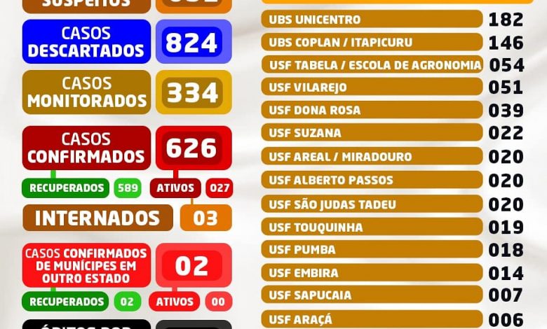 Apresentamos 626 casos confirmados para COVID-19, e destes 27 (vinte e sete) ATIVOS, sendo acompanhados pela vigilância em saúde, 03 destes estão internados em Hospital referência para Covid19.