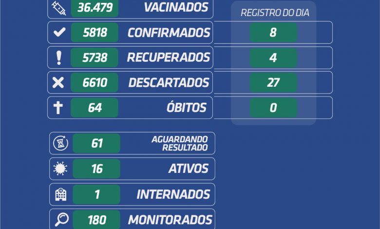 *Foram registrados 08 novos casos* de Coronavírus, e * descartados 27 casos que aguardavam resultados dos exames, nessa quinta-feira, dia 19 de agosto de 2021.