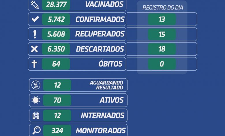 *Foram registrados 13 novos casos* de Coronavírus, e * descartados 18 casos que aguardavam resultados dos exames, nesse domingo, dia 01 de agosto de 2021.