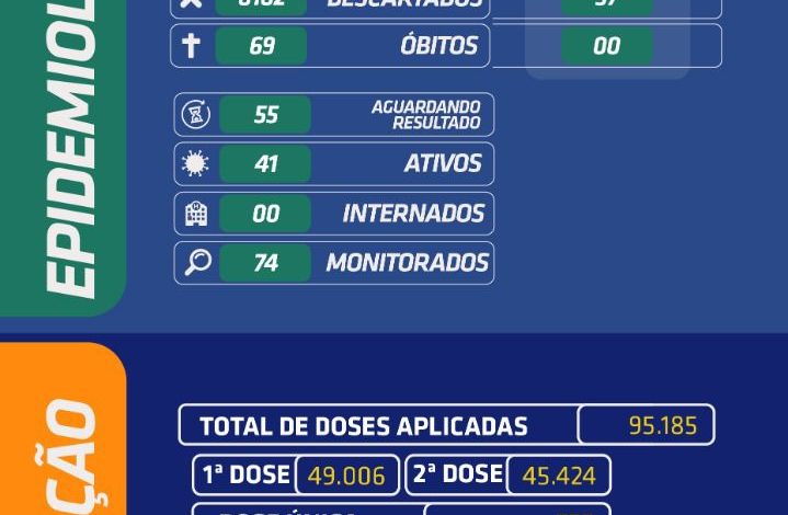 No total 41 casos estão ativos, sendo que não há pacientes internados em Unidades Hospitalares de referência para Covid-19. O Município já confirmou desde o início da pandemia 6.019 casos e houve 69 óbitos. No momento 55 pessoas aguardam resultado dos exames e 5.909 pacientes já estão recuperados.