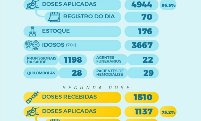 Já foram aplicadas 4.944 doses e restam 176 doses em estoque, que estão sendo utilizadas para vacinação de idosos a partir de 70 anos, profissionais de saúde, agentes funerários, coveiros, pacientes de hemodiálise e quilombolas. Nessa quinta-feira (25) foram aplicadas 70 doses.