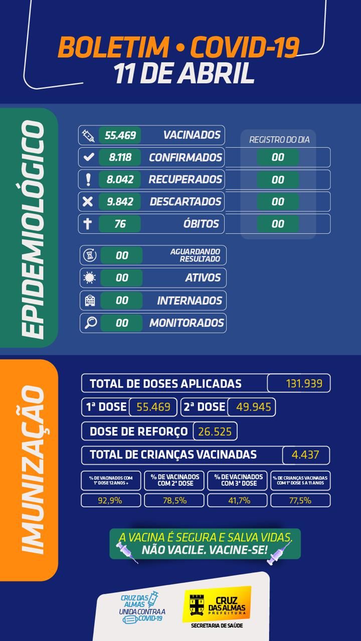 O Município de Cruz das Almas, zerou o número de casos ativos de covid-19. A informação foi divulgada pela Secretaria de Saúde no Boletim Epidemiológico desta segunda-feira (11/04).