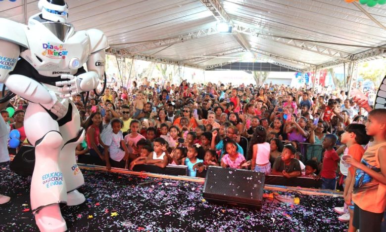 Com o tema “Brincando com instrumentos musicais”, a programação do Dia de Brincar contou com apresentações de personagens animados, como o Robozão e o grupo Loly Popy, além dos shows da Banda Pé de Lata, do animador Rodrigo Cardoso com o Mega Show Labubônico e do Palhaço Pipoca e Sua Turma.