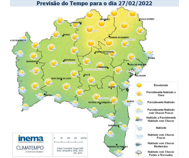 No domingo (27), o tempo apresentará estabilidade atmosférica em todo o estado da Bahia. Segundo o Inema, um centro de alta pressão manterá as regiões Norte, Nordeste, Chapada Diamantina e São Francisco com tempo firme e céu claro, possibilitando um dia com altas temperaturas nas cidades dessas regiões.