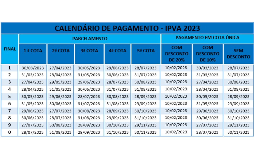 Tabela do IPVA de 2023 — Foto: Sefaz Bahia