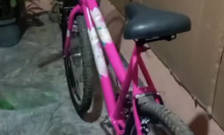 A bicicleta é de cor rosa, possui paralamas pretos de plástico e não tem os adesivos que aparecem na imagem divulgada pelo dono.