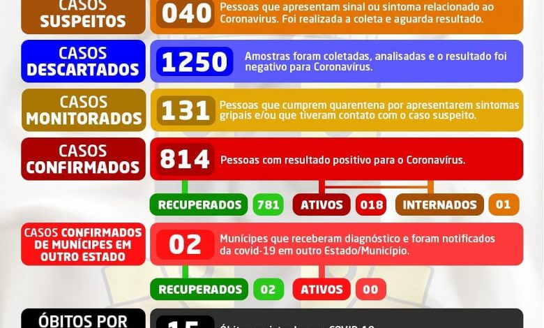 Apresentamos 814 casos confirmados para COVID-19, e destes 18 (dezoito) ATIVOS, sendo acompanhados pela vigilância em saúde e, destes, 01 está internado em Unidade de referência para Covid19.