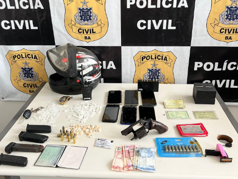 Entre os objetos apreendidos, estão um revólver calibre .38 Taurus, duas munições calibre 9mm, uma cartela com 10 munições calibre .38 intactas, oito munições calibre .38, 69 pedras de crack, 100 pinos de cocaína, três carregadores de pistola Glock calibre .380, um carregador de PT 58 Taurus calibre .380, um aparelho radioamador, dois aparelhos celulares Motorola azuis, um aparelho celular Nokia dourado, um aparelho celular LG azul, um aparelho celular Positivo preto, chaves de um veículo Ford Focus, documento da motocicleta roubada, um relógio de pulso Technos dourado, um receptor de TV e um título de eleitor de uma das vítimas.