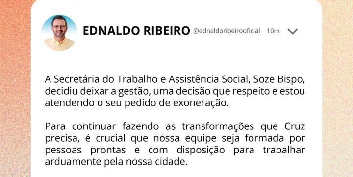 “A Secretaria do Trabalho e Assistência Social, Soze Bispo, decidiu deixar a gestão, uma decisão que respeito e estou atendendo ao seu pedido de exoneração.”
