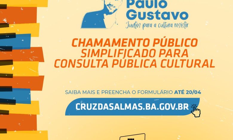 A Prefeitura de Cruz das Almas, por meio da Secretaria de Esporte, Cultura, Turismo e Lazer, abriu um sistema on-line de consulta pública com o objetivo de fomentar as produções artísticas e culturais e acolher sugestões sobre a aplicação de recursos advindos da lei Paulo Gustavo para o Município. A consulta estará aberta até o próximo dia 20 de abril para trabalhadores da cultura, da economia criativa e solidária e coletivos culturais.