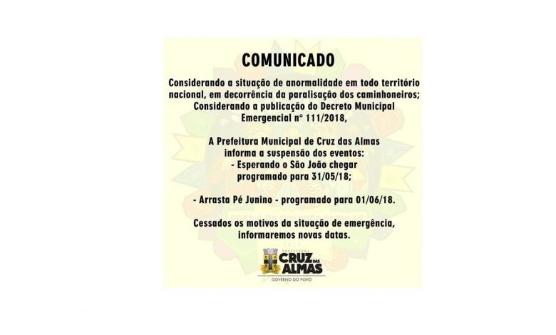 A prefeitura municipal de Cruz das Almas considerando a situação de anormalidade em todo território nacional, em decorrência da paralização dos caminhoneiros; considerando a publicação do decreto municipal emergencial n.º 111/18, informa a suspenção dos eventos: