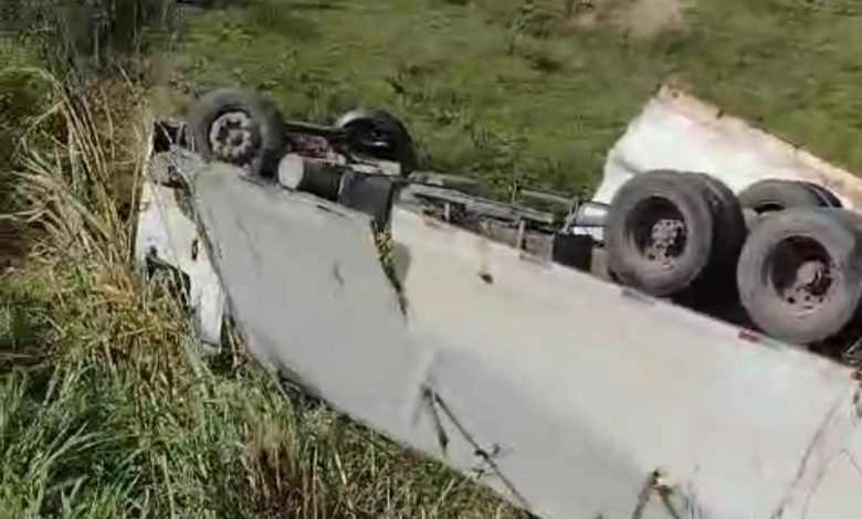Na tarde desta quarta-feira, 18 de setembro, um caminhão baú desceu uma ribanceira e virou na BR-101, no trecho de Sapeaçu.
