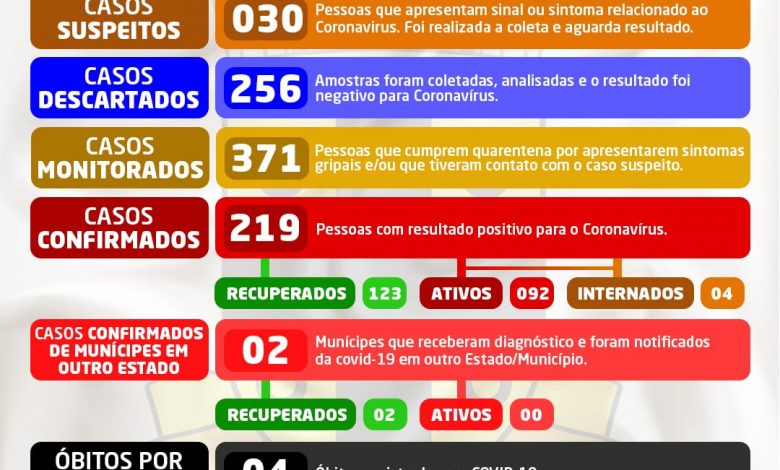 Apresentamos 219 casos confirmados para COVID-19, e destes 92 (noventa e ativos) ATIVOS, sendo acompanhados pela vigilância em saúde, 04 destes estão internados em Hospital referência para Covid19.