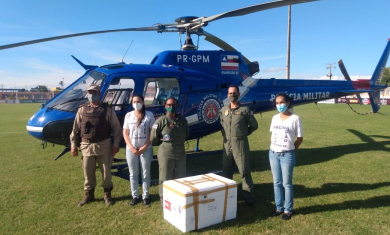 O imunizante chegou ao município por meio de um helicóptero do Grupamento Aéreo da Polícia Militar (Graer).