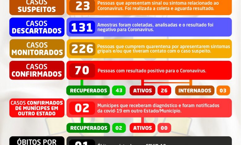 A Prefeitura Municipal de Cruz das Almas vem informar que hoje, 20 de junho de 2020, tivemos mais 01 novo caso confirmado para o novo Coronavírus e agora são 70 casos confirmados.