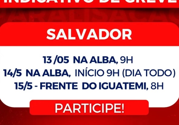 Os servidores públicos da Saúde realizarão uma paralisação de 72 horas, com indicativo de greve, nos dias 13, 14 e 15 de maio, com a seguinte programação de mobilizações: 13 de maio, às 9h, na ALBA; no dia 14 de maio, intenso ATO na ALBA, com início às 9h; no dia 15 de maio, às 8h, no Shopping da Bahia.