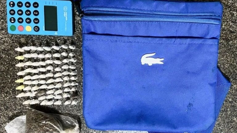 Com o suspeito, os agentes conseguiram apreender 75 pinos de cocaína, 2 porções de maconha e uma máquina de cartão.