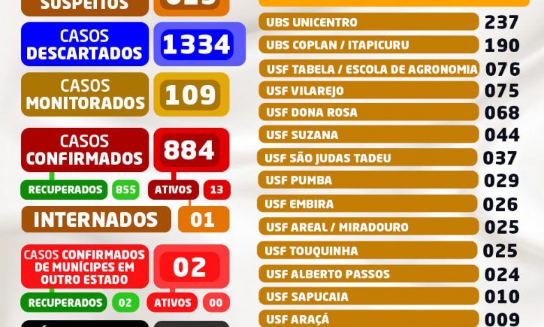 Apresentamos 884 casos confirmados para COVID-19, e destes 13 (treze) ATIVOS, sendo acompanhados pela vigilância em saúde e destes, 01 encontra-se internado em Hospital referência para Covid19.