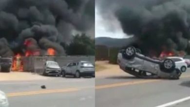 Carreta cegonha tomba com carros e pega fogo na Bahia
