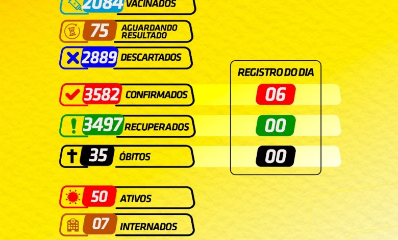 O Município já confirmou 3.582 casos e houve 35 óbitos. No momento 75 pessoas aguardam resultado dos exames e 3.497 pacientes já estão recuperados.