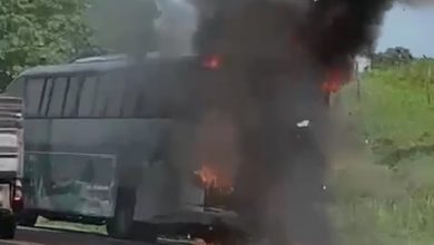 Ônibus com passageiros pega fogo na BR-101, região de Governador Mangabeira