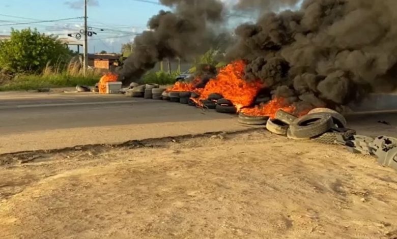 Moradores e comerciantes da região de Cacha-Pregos, na cidade de Vera Cruz, na Ilha de Itaparica, fazem uma manifestação na manhã desta segunda-feira (2), na BA-001. O grupo, que usa pneus queimados e interdita a pista, pede melhorias na rodovia.