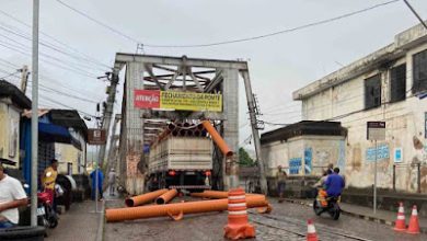 Caminhão carregado de tubos fica preso na ponte D. Pedro II, entre São Félix e Cachoeira