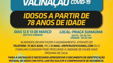 Cruz das Almas: Nesta sexta e sábado idosos a partir de 78 anos já podem se vacinar no drive thru, na Praça Sumaúma